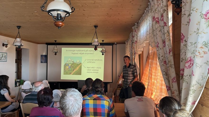 Další přednášku přednesl MUDr. Vladimír Vinduška a věnovala se Energetické náročnosti výstupů v hypoxii. Jistě si řada horolezců před expedicí do hor klade otázku, zda jsou výstupy v hypoxickém vysokohorském prostředí doprovázeny zvýšenými energetickými nároky. Stejnými otázkami se zabýval autor přednášky již v roce 1986 v rámci příprav na expedici do oblasti Pamiru, kde to řešil přidáváním maltodextrinu do pokrmů.