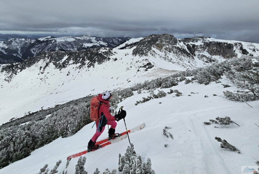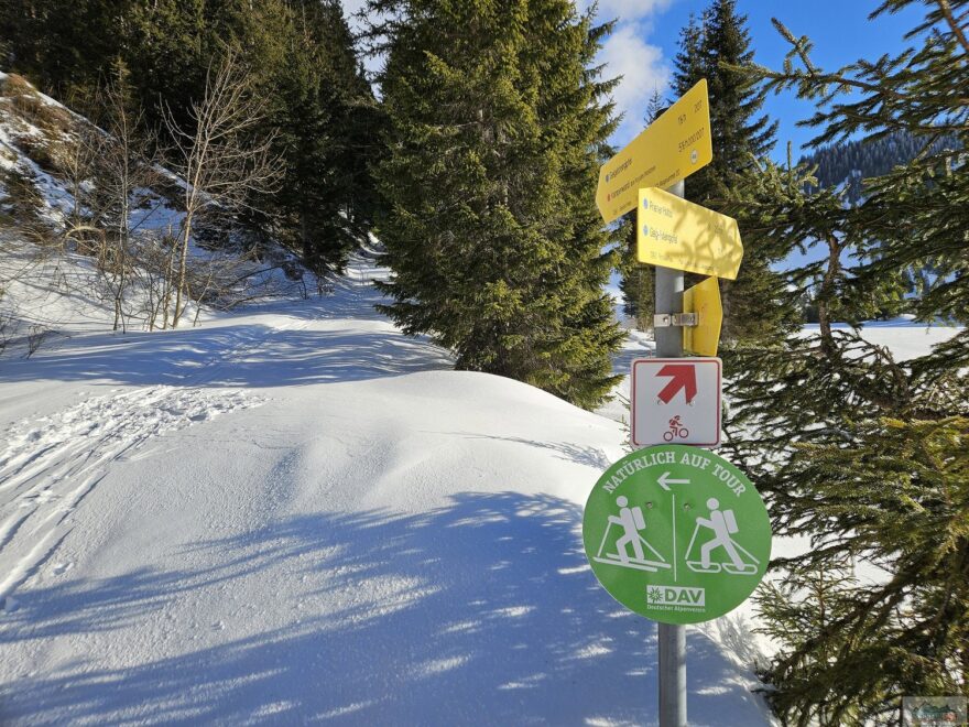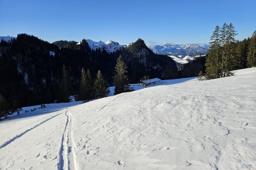 Pokračujeme dále mírným stoupáním po sáňkařské dráze, dokud nenarazíme na rozcestník, kde zelené označená skialpová značka DAV (Deutsche Alpenverein) nás konečně posílá do skialpové stopy. Po chvíli se vynořujeme z lesa a otevírá se nám krásný výhled na okolní vrcholy.