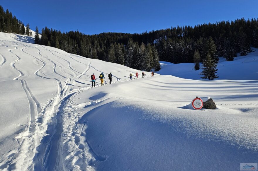 Průchod skalní soutěskou se třemi krátkými tunely vysekanými ve skále stoupáme po silnici nad potokem Klammbach až do první zatáčky o sto osmdesát stupňů. V zatáčce odbočujeme na vyšlapanou skialpinistickou stopu, která ve svahu kopíruje potok. Místy se objevují povedené výhledy, ale větší část zatím vede lesem. Výše ve dvou strmějších traverzech nastoupáme na cestu, z níž se otevírají lepší výhledy.