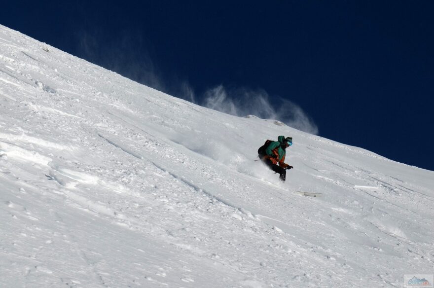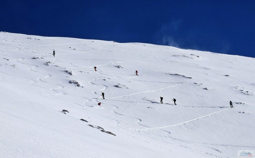Po vynadívání se na parádní kruhové výhledy na nepřeberné množství vrcholů a dolin se vracíme po hřebenu zpět na předvrchol. Z něj sestoupíme kousek k lyžím a připravíme se na sjezd. Pokud přes týden nasněžilo, tak je i přes oblíbenost Lugaueru možné lyžovat nerozježděným sněhem. Na planinu nás čeká skoro šest set výškových metrů parádního sjezdu.