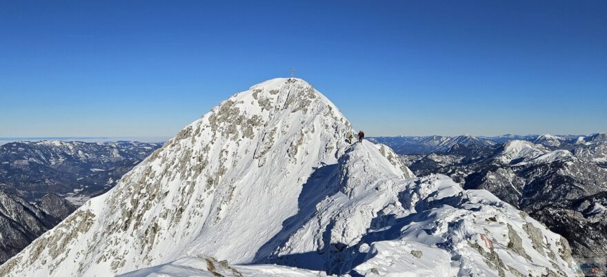 Níže to můžou být i větší traverzy, které výše zkracujeme. Umístění ski depotu záleží také na množství sněhu. V lednu 2025 bylo sněhu méně, a proto byl v 2100 metrech. Za drobých sněhových podmínek je možné začít sjezd kousek pod předvrcholem Lugauer Plan (2160 m). Ze skidepotu pokračujeme pěšky a podle podkladu je vhodné použít stoupací železa, případně i cepín. Z Lugauer Planu je hřebenovka k vrcholovému kříži na Lugaueru (2217 m) místy úzká a exponovaná, a vede přes další nevýrazný vrcholek.