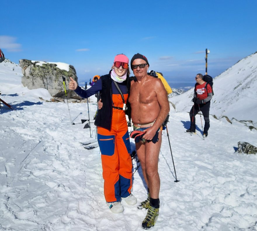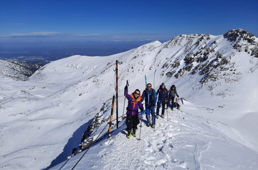 Ještě se fotím s Jackem Nicholsnem a po pauze stoupáme asi 100 výškových metrů, kde většina z nás nechává lyže, nasazuje stoupací železa a vyráží na posledních 200 výškových metrů na vrchol. Pár odvážlivců bere lyže na batoh s tím, že dolů se dostanou jedním ze žlabů vedoucích z vrcholu. Prudkým hřebenovitým výstupem podél ocelových lan se dostáváme až na samotnou střechu Balkánu (2925 m). Závěrečná mačková pasáž nám zabrala asi 30-40 min. Počasí vyšlo nádherně, takže nechybělo kochání se nádhernými výhledy.