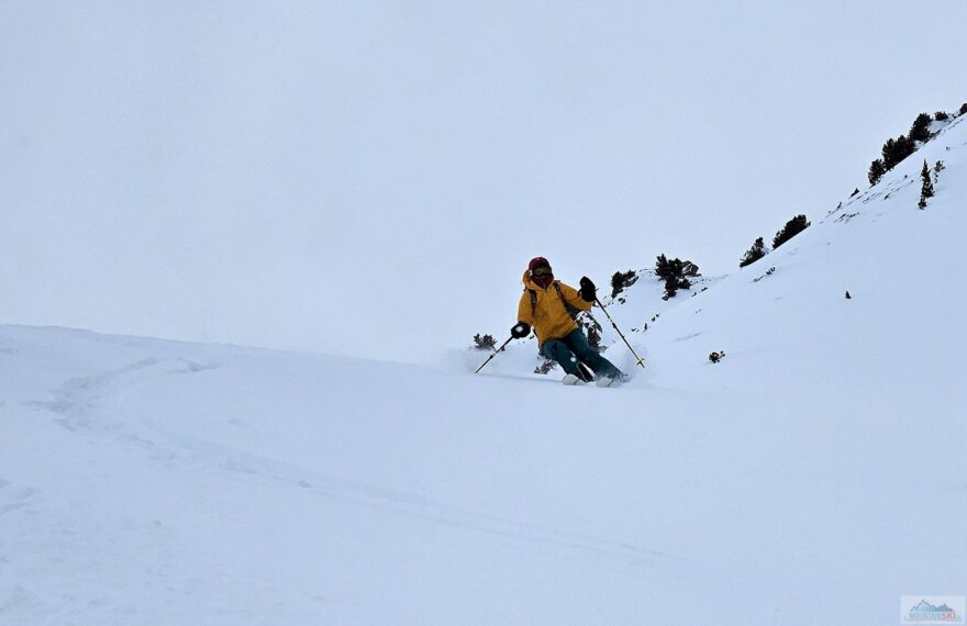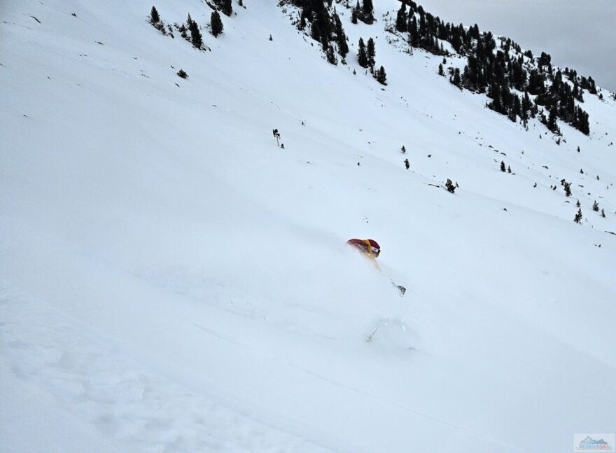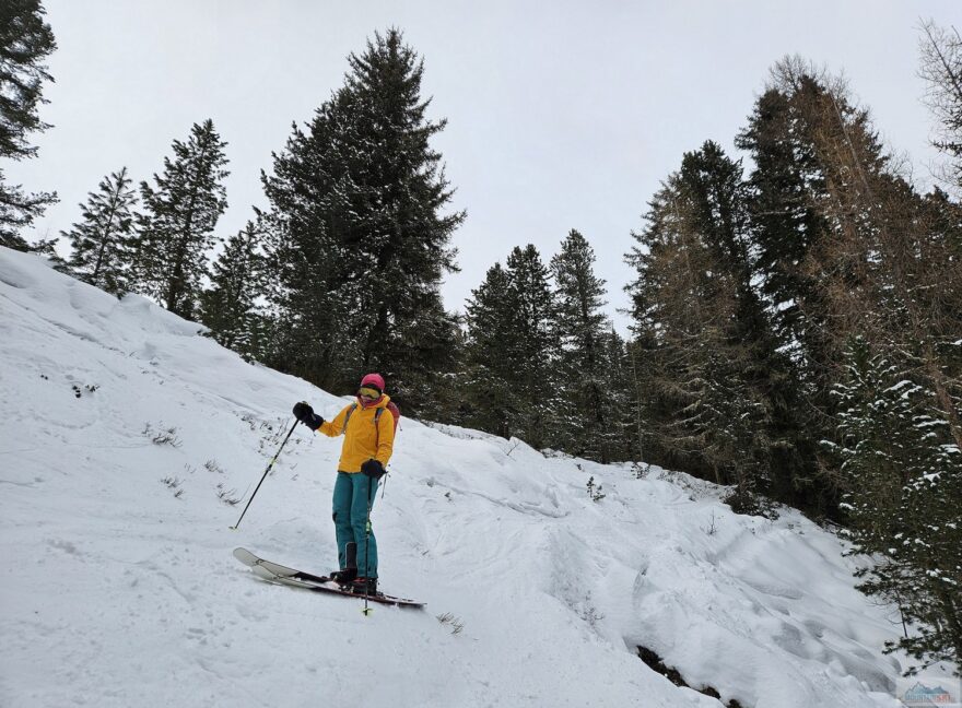 Další krásný prašan je na východně orientovaných svazích z výšky asi 2200 metrů. Níže přejíždíme přes potok Wörgetalbach a napojujeme se na skialpovou dálnici. Projíždíme kolem Knappenhausu se zamrznutým vodním kolem a mírným svahem dojíždíme k Hüttenwerk Wörgetal. Odtud začíná lesní úsek, který za vysoké sněhové pokrývky může být parádní, ale v lednu 2025 tady moc sněhu nebylo. Sjezd tak byl velmi zábavný přes vyježděné muldy, trčící kameny a s vyhýbáním se stromům.