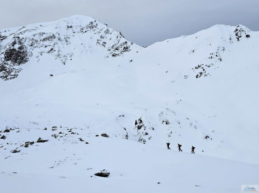 Vzhledem k velké popularitě vrcholu by jen velký optimista očekával nerozježděné svahy pokryté prachovým sněhem. Kupodivu i při vysoké návštěvnosti je možné najít prašan. Pár desítek výškových metrů pod vrcholem je svah celý rozlyžován, ale o kousek níže stačí vybočit k jihu a najít úseky bez jediné stopy. To se opakuje od cca 2360 výškových metrů při prudkém odbočení na sever, kde je část svahu pokrytá stopami, ale hned vedle je panenský sníh. Následuje rovinatá pasáž, kde je potřeba občas použít jak hole, tak bruslit. Od splitboardistů jsou tady hluboké stopy, jak se pěšky propadali do sněhu.