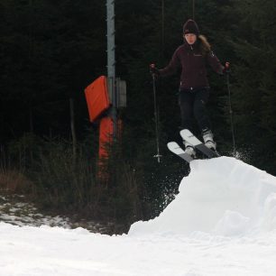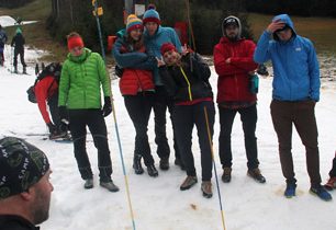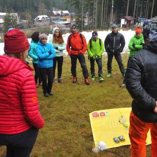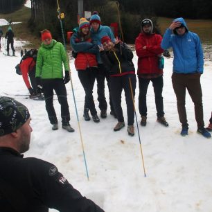 V trávě u lesa probíhala první část lavinového školení než došlo k přesunu k hromadám technického sněhu. Mezitím dolů po skupinkách sjíždí účastníci zlepšování sjezdových technika a skákání. Chvilku váhám, protože by se mi taky hodila, načež to hned z hlavy vyženu, jelikož mé závodní ambice jakoukoliv techniku v průběhu závodu zprzní.
