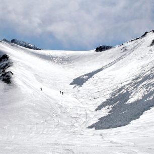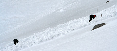 - Pozorně sleduj strženého v lavině, a hlavně místo, kde zmizel pod sněhem nebo v jeho zvířených oblacích. Dívej se neustále na pohyb mas sněhu s cílem zahlédnout, jestli se stržený ještě objeví na povrchu. Sleduj lavinu až do jejího úplného zastavení a propoj si v závislosti na terénu místo posledního zahlédnutí strženého s čelem lavinového nánosu.