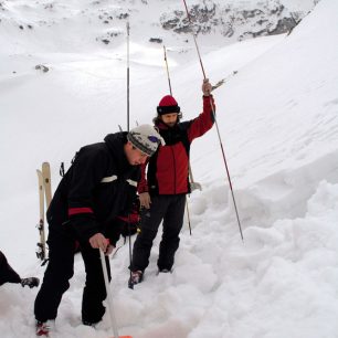 - Na prvním místě je bezpečnost záchranáře/ů, a proto se ujisti, jestli nemohou spadnout sekundární laviny a jaké by mohly být jejich dráhy.