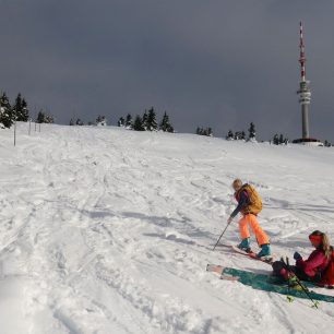 Na Praděd vede dále tyčové značení, což se v hustém sněžení a mlze dost hodilo. Vysílač se objevil těsně pod vrcholem, kde je možné ho obejít ze západu nebo z východu. Při prvním výstupu jsme dali přednost východnímu směru. Ve vysílači bylo otevřené “hladové okénko” na teplý čaj nebo nealko pivo, což bylo kvůli desetileté skialpinistce využito. Dali jsme si dva sjezdy, kde kromě úvodní pasáži po tyčích, byl zbytek parádní v hlubokém sněhu.