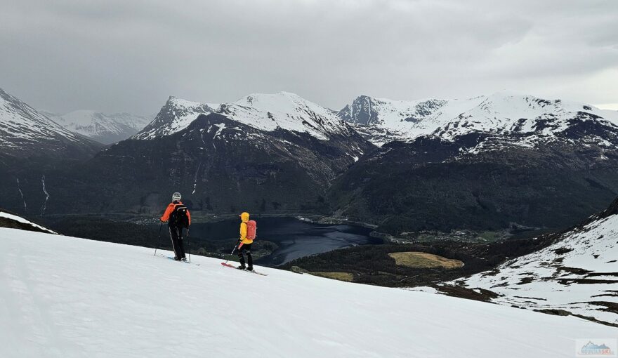 Při sjezdu z vrcholu Eidskyrkja (1482 m) s výhledem na fjord