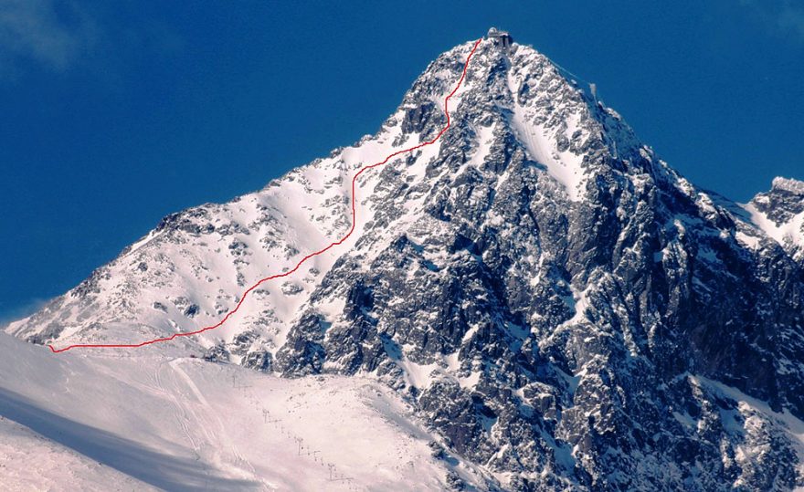 Nákres zjazdu z Lomnického štítu do Lomnického sedla (horná časť do 50°, nižšie do 40°)