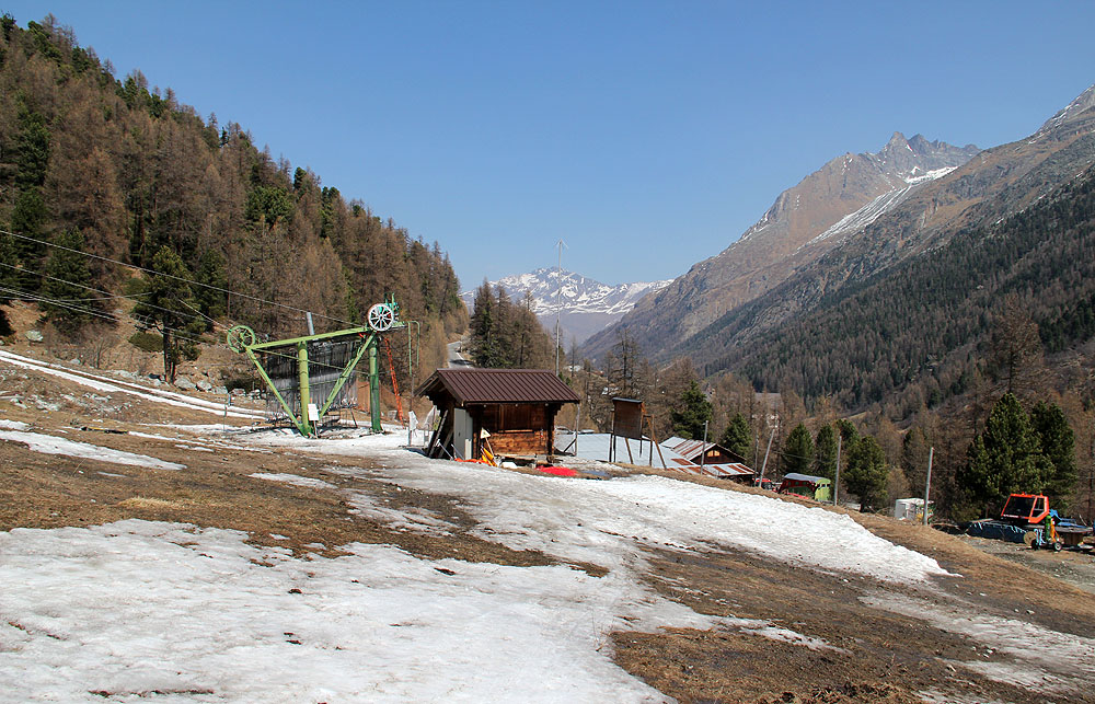 Pohled k severu na Arollu přes roztáté sjezdovky