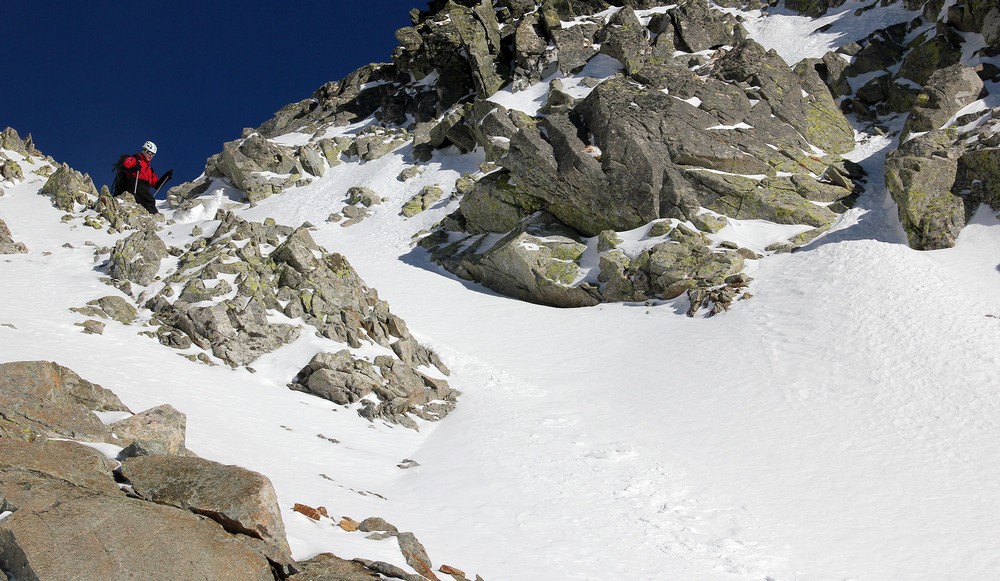 Začátek sjezdu z Baranieho sedla za nižšího stavu sněhu