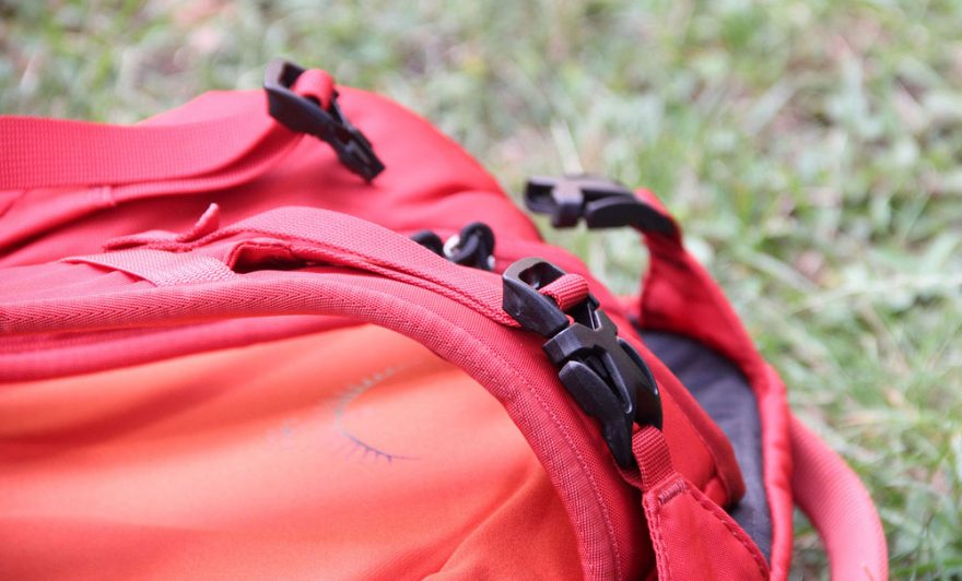 Zapnutá přeska propoující ramenní popruh s batohem. Vojtěch Dvořák