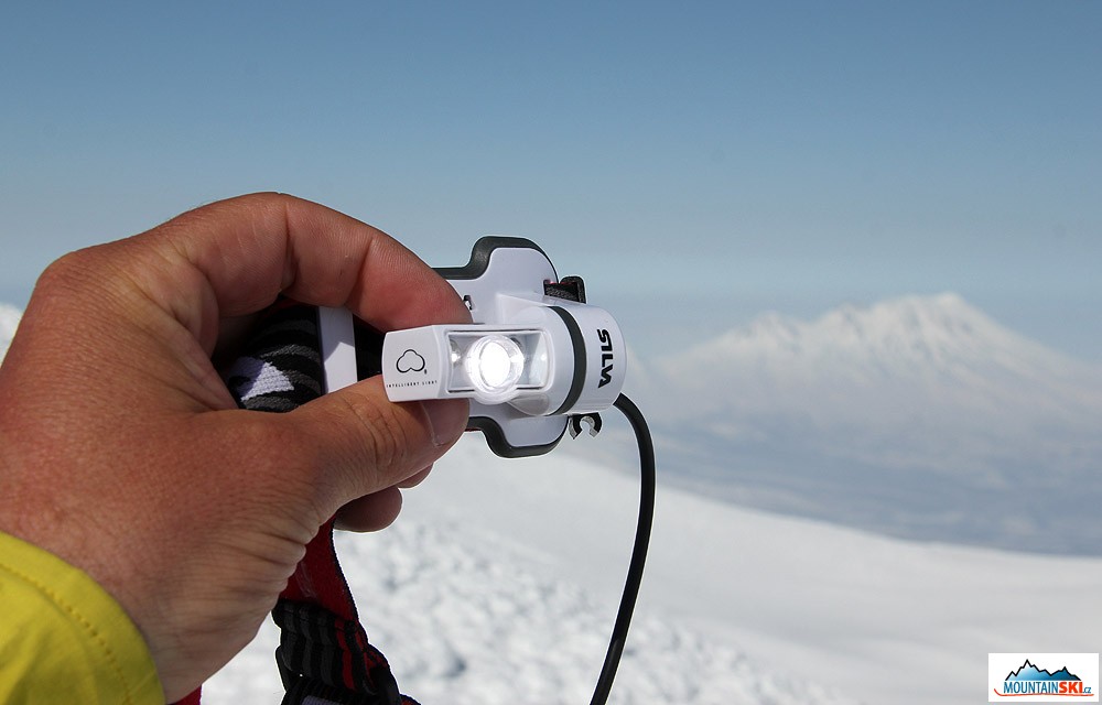 Čelovka zapnután na maximum na vrcholu Korjakského, v pozadí vulkán Zhupanovskij