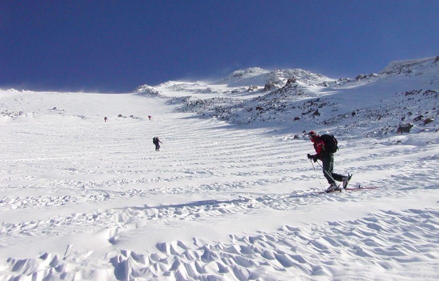 Výstup širokým svahem nad chatou směrem k vrcholu Damavandu