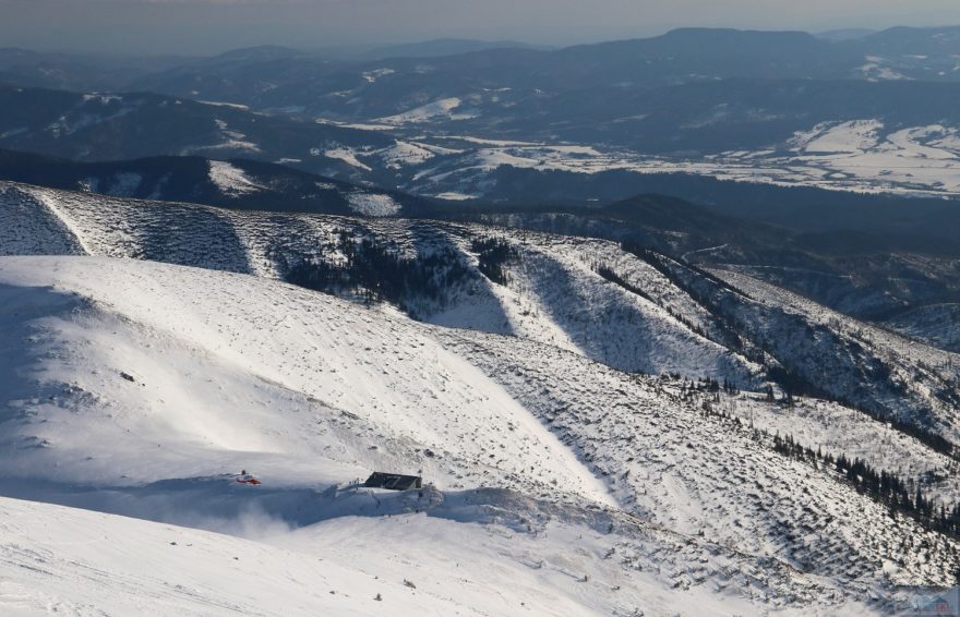 Záchrana s vrtulníkem u Chaty M.R. Štefánika při pohledu z podvrcholového traverzu