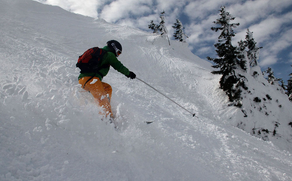 Stylový sjezd s téměř propnutou spodní nohou