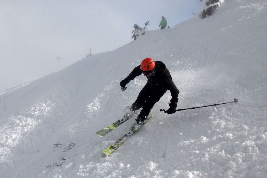 Nestandardní provedení oblouku na vnitřní lyži, vnější je vysoko ve vzduchu – freeride na Jahorině