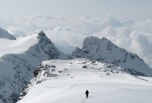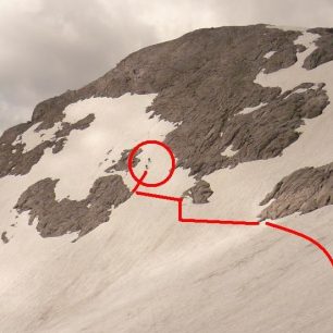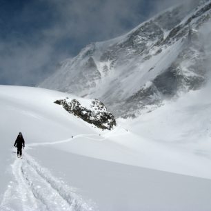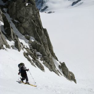 Sjíždíme strmý svah a pak pravým traversem až k výrazné ostruze, Haute Route