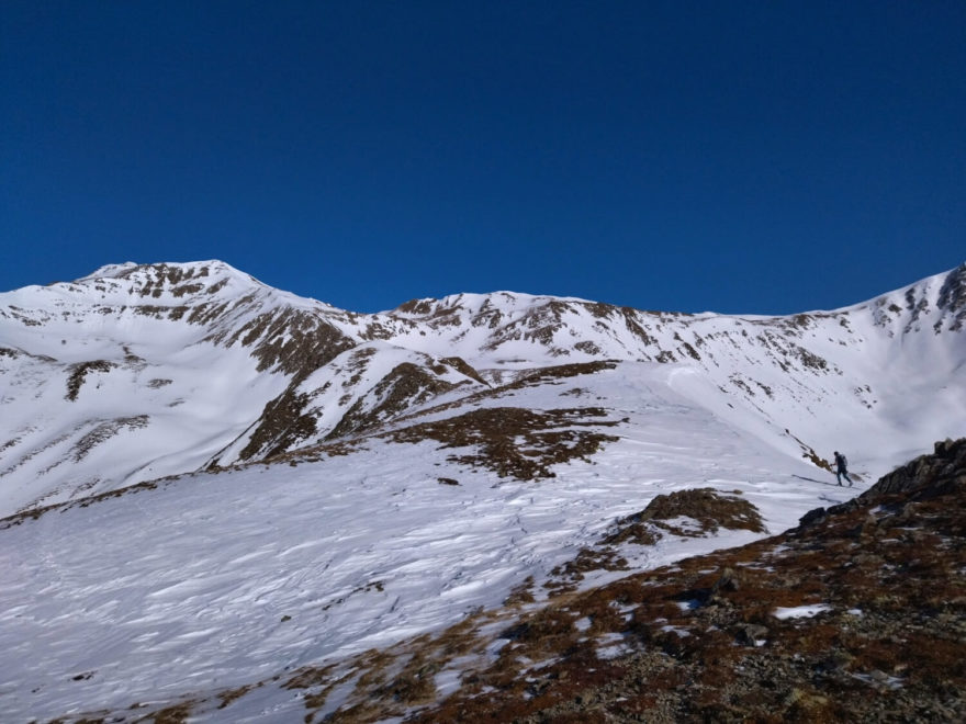 Hřeben od Spielbuhel při výstupu k majestátnímu vrcholu Hochkreuzspitze nad Santa Maddalenou, Jižní Tyrolsko, Itálie.