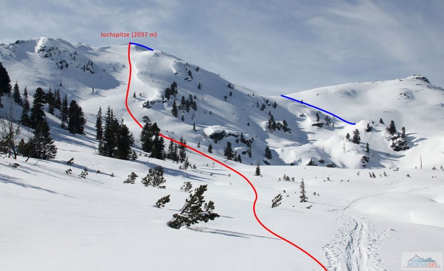 Výstupová trasa je modře, sjezdová z Jochspitze červeně