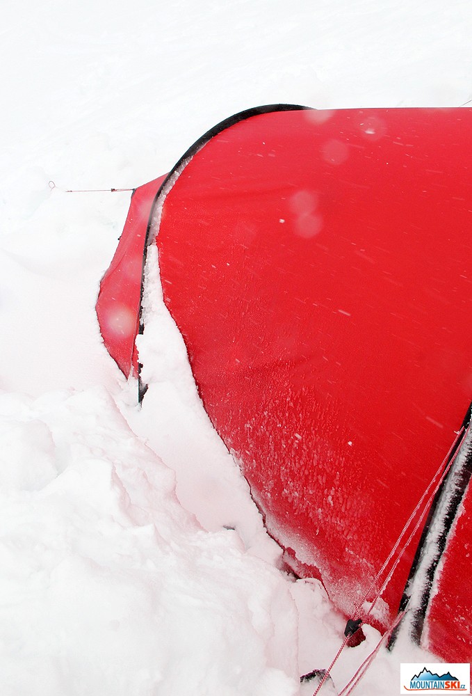 Když sněží vodorovně – Hilleberg Nallo 2 GT odkopaný z boku