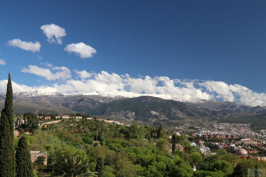 Výhled z Granady na zasněžené pohoří Sierra Nevada