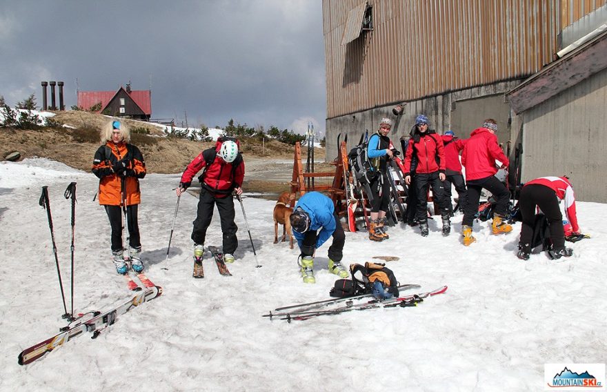 Kombinováno – skialpinisté a telemarkoví lyžaři se chystají ke sjezdu, spojeno s Pažoutem a jeho kolegy z Přerova