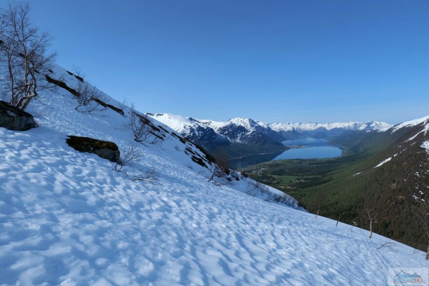 V dolní části výstupu na Kyrkjetaket (1439 m) s vyhlídkou na Isfjorden