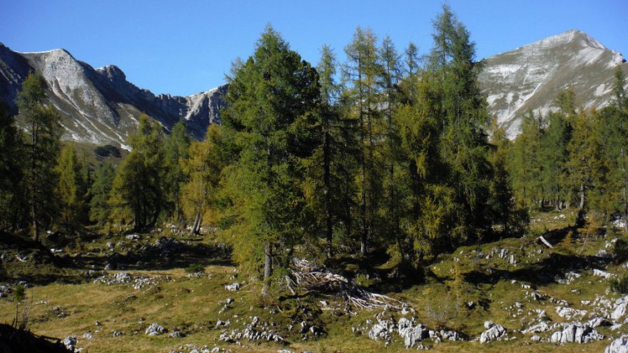 Galerie: Lednové telemarkové hledání prašanu v modřínových lesích Totes Gebirge