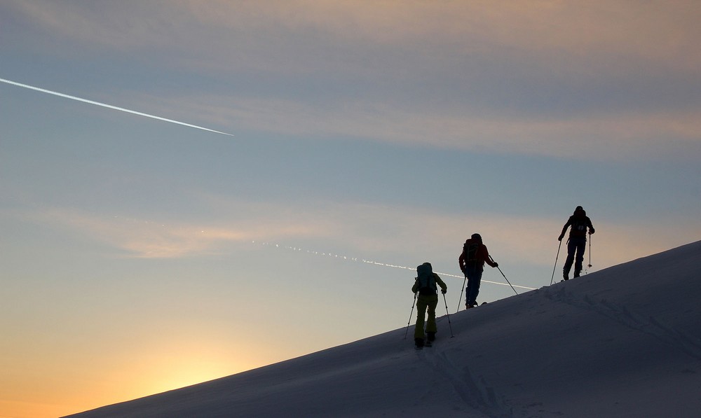 Stoupání k dalším sjezdu při zapadajícím slunci