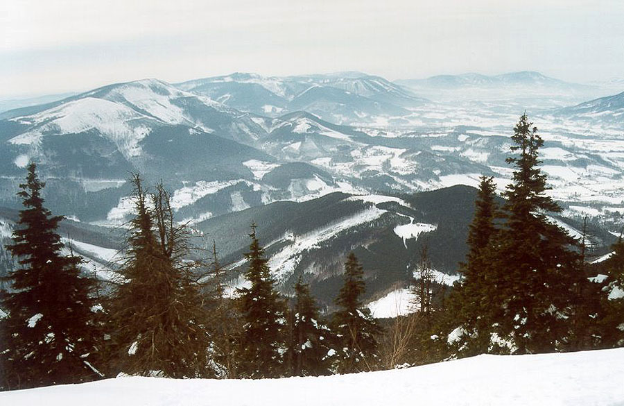 Starší výhled z Lysé hory na Smrk, Kněhyni a Radhošť