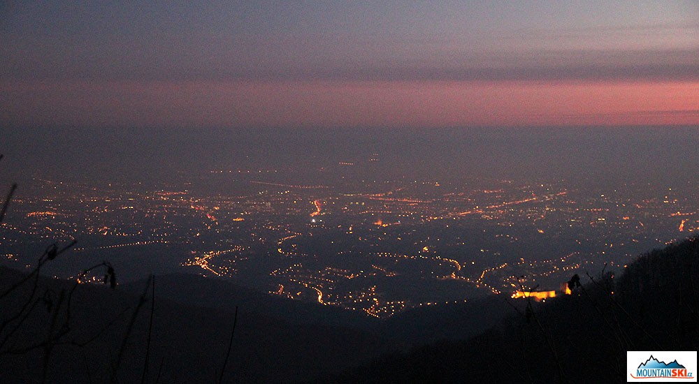 Noční Záhřeb z nadhledu od Sljeme, vpravo hodně svítí ruiny historické pevnosti