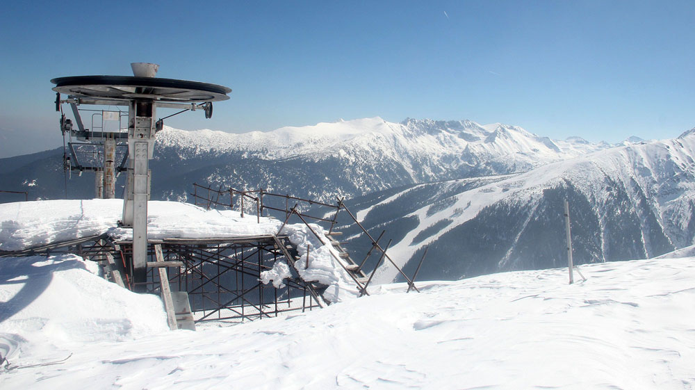 Výhled od bývalé horní stanice sedačkové lanovky na lyžařské středisko Bansko