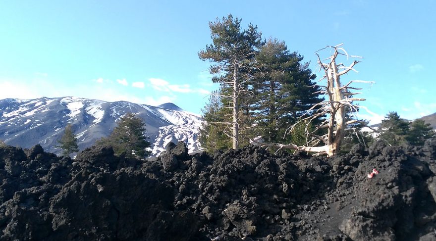 Prvý pohľad na Etnu cez lávové prúdy lemujúce okraje cesty. So snehom to vyzerá biedne z tohto pohľadu, zatiaľ z toho dobrý pocit nemáme, ale optimizmus nestrácame