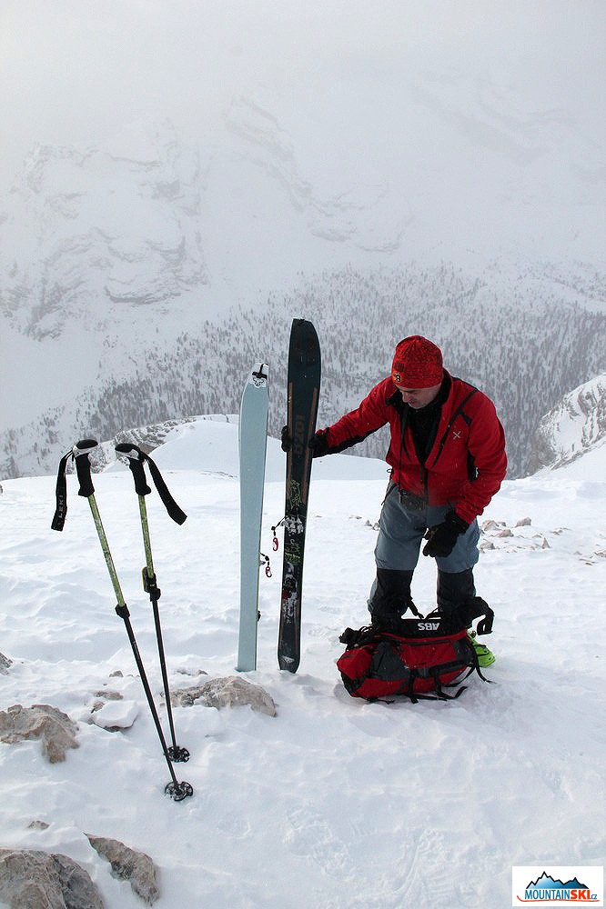 Na vrcholu Col Bechei de Sora – pásy z lyží Dynafit Cho Oyu dolů