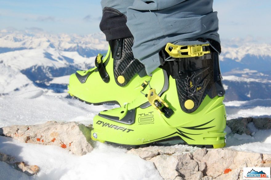 Plně rozepnuté boty Dynafit TLT6 Performance s měkkým zeleným jazykem pod vrcholovou skálou na Zehner Spitze