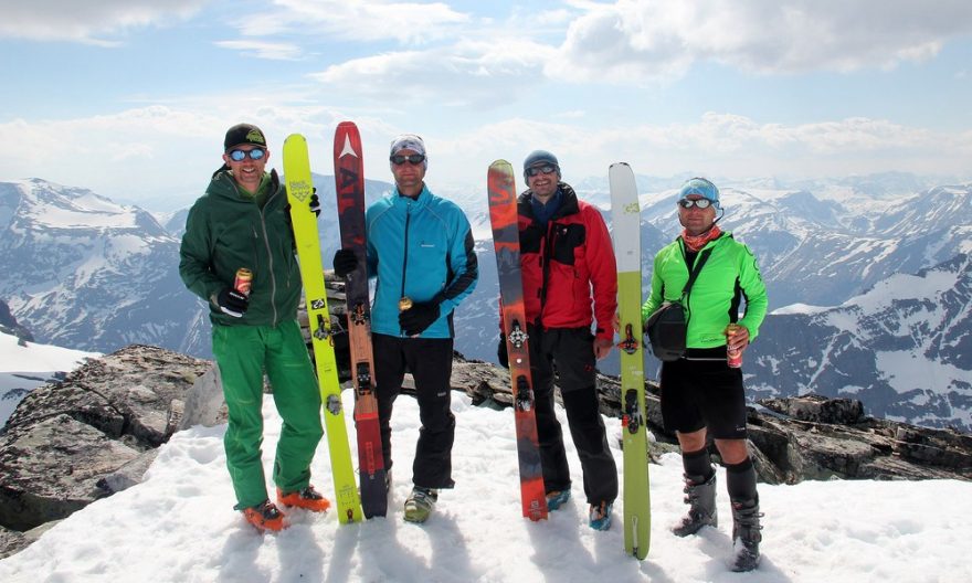 Vrcholová skupinka na Dronningkroně s obligátním přerovským pivem Zubr