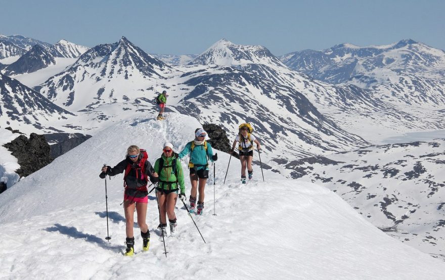 Norský dívčí skialpový tým na vrcholovém hřebenu Storebjørnu