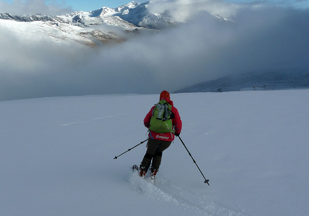 Zjazd od vrcholovej stanice lanovky v čerstvom prašane po ľadovci Hochjochferner