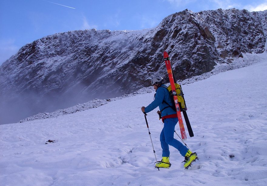 Zlyžovali sme až pod hranicu 3000 m, kde je menej snehu a tak lyže idu na batoh
