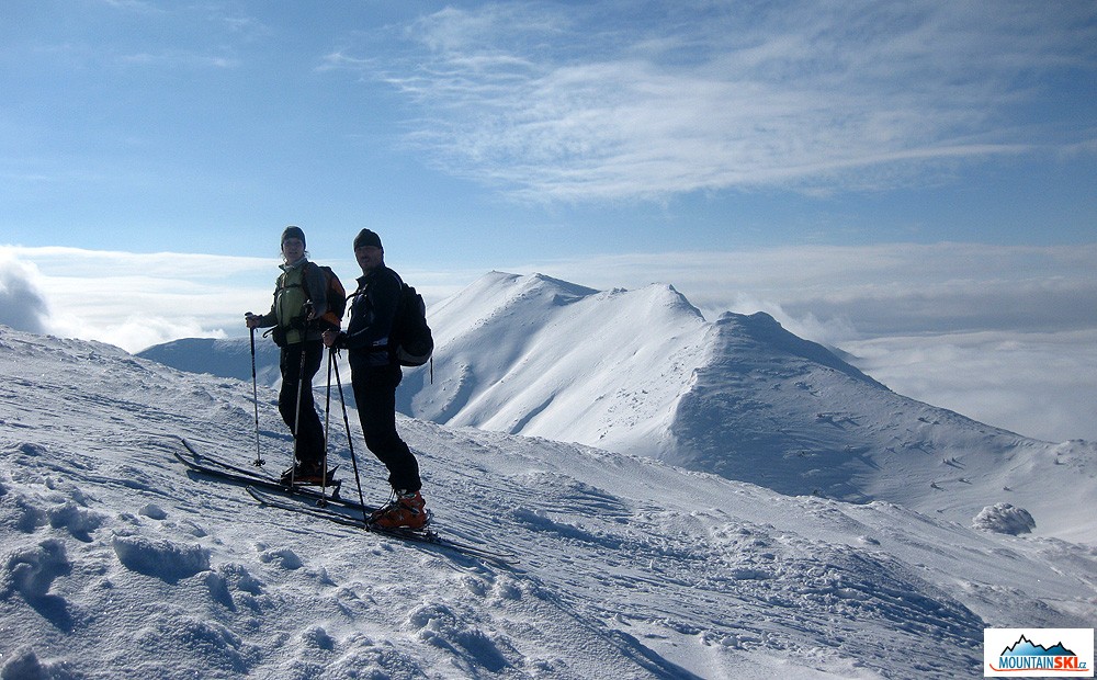 Stoupáme na Pekelník 1609m za krásného slunečného počasí, Ečí neúnavně vykládá další ze svých horolezeckých příběhů