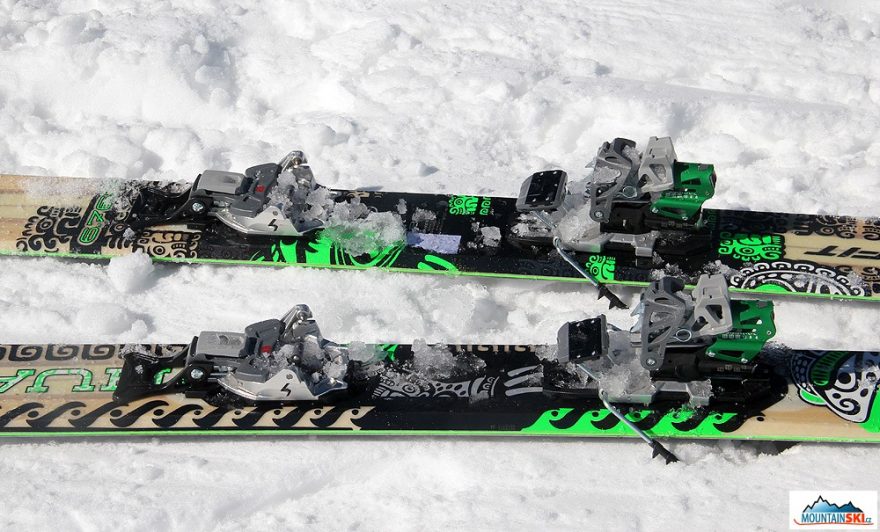 Vázání Dynafit BEAST na lyžích Dynafit Huascaran na makedonském sněhu, špička přepnuta na výstup, pata už je ve sjezdové pozici