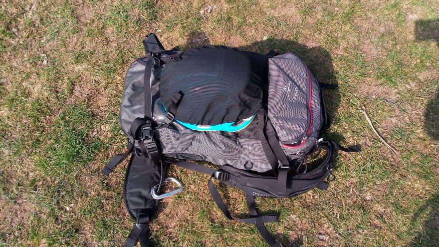 Jedno ze dvou uložení přilby do síťky na batohu Osprey Soelden PRO 32