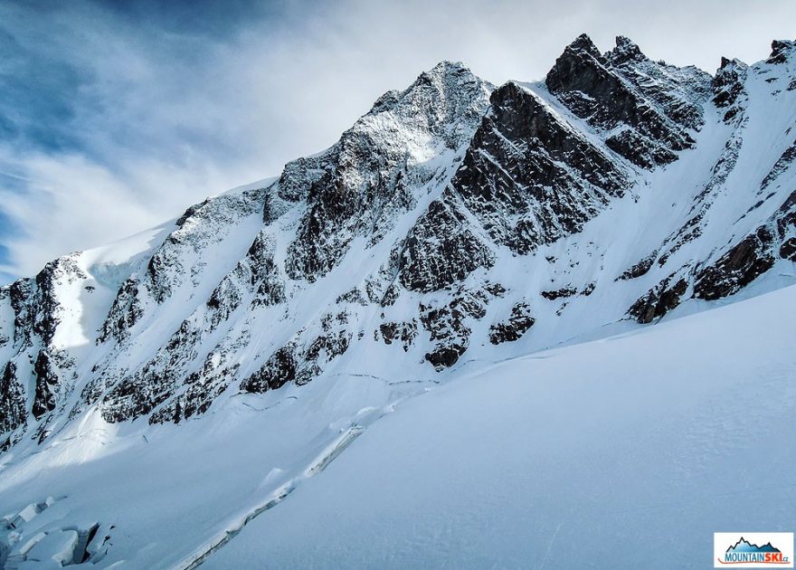 Toto sú seraky, a za nimi je náš hlavný cieľ výletu – Pallavicinirinne, vpravo vedľa neho Berglerrinne, ktorý zlyžoval z nás štyroch len Rasťo a Mišo