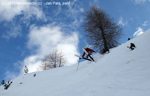 Čeněk při precizně provedeném přeskakovaném oblouku ve značně strmém terénu – lyže Dynafit Nanga Parbat v akci