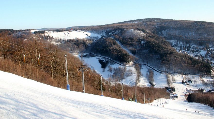 Hlavní sjezdovka v lyžařském areálu s výhledem na Pramenáč