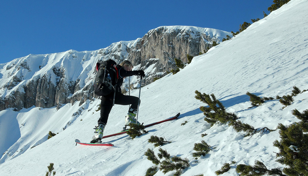 Otáčení na svahu na zledovatělém podkladu s výhledem na skalnatý uzávěr údolí