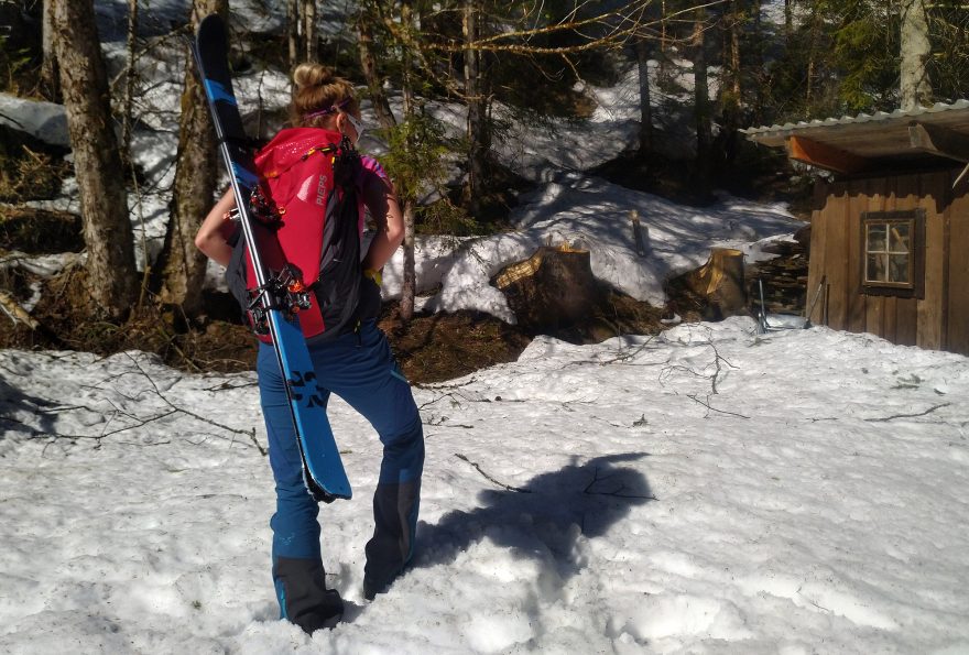 Diagonálně uchycené lyže na Pieps JetForce 2.0