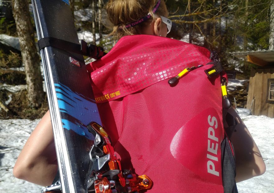 Detail uchycení lyží diagonálně na Pieps JetForce 2.0. 35